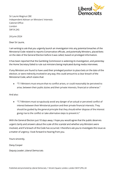 I’ve written to the PM’s Ethics Adviser, asking him to urgently investigate whether any Conservative Ministers were involved in the betting scandal, and to determine if any who were have breached the Ministerial Code. The public deserve to know before polling day. My letter below.